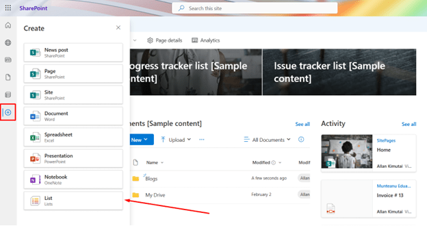 The first step is to access a SharePoint site and click the plus sign in the left navigation bar to expand a couple of options. ‘Lists will appear as the last item. Click on it to trigger the list creation wizard. By default, the list will be saved under ‘My Lists’ and be stored in your OneDrive unless you change the “Save to” dropdown to create it in a specific SharePoint site.