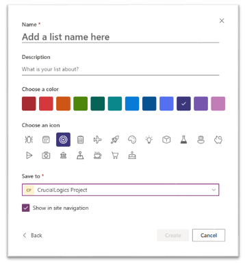 Choose this option to start from scratch. Enter a name, provide a description, choose if you want it save the list to “My Lists” or a SharePoint site, and adjust any additional settings as needed. Once configured, click ‘Create’ to proceed.